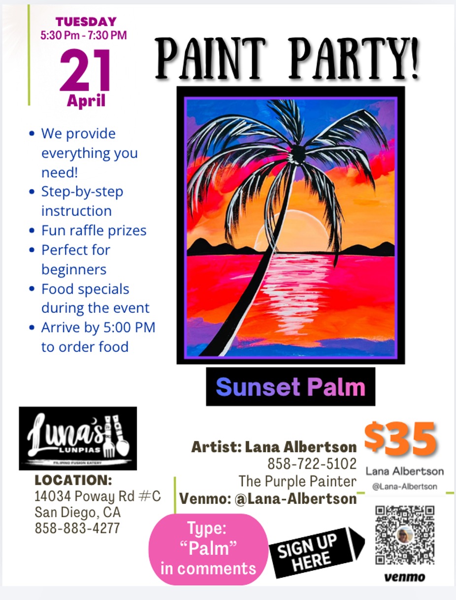 ✨ Aloha and Mabuhay✨ Paint Night with @lana_the_purple_painter is BACK for the Spring @lunaslunpias 🎨🥟 Whether it’s a date night, girls’ night out, family night, kids’ creative fun, or a little solo self-care, our Paint Nights are for everyone. No pressure, no experience needed—just good vibes, good food, and a canvas waiting for your creativity. 💜 Come paint, sip, snack, laugh, and make memories with us. Bring your partner, your besties, your kiddos—or just YOU. We’ve got the brushes, the beats, and the LUNpias ready. 🖌️✨ 🗓️ Spots fill fast—come create with us! #PaintNight #LunasLUNpias #FilipinoFusionEatery #GirlsNightOut #DateNightIdeas FamilyFun 🎨
